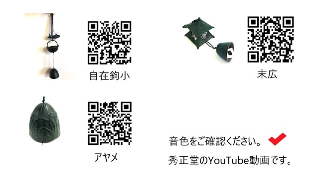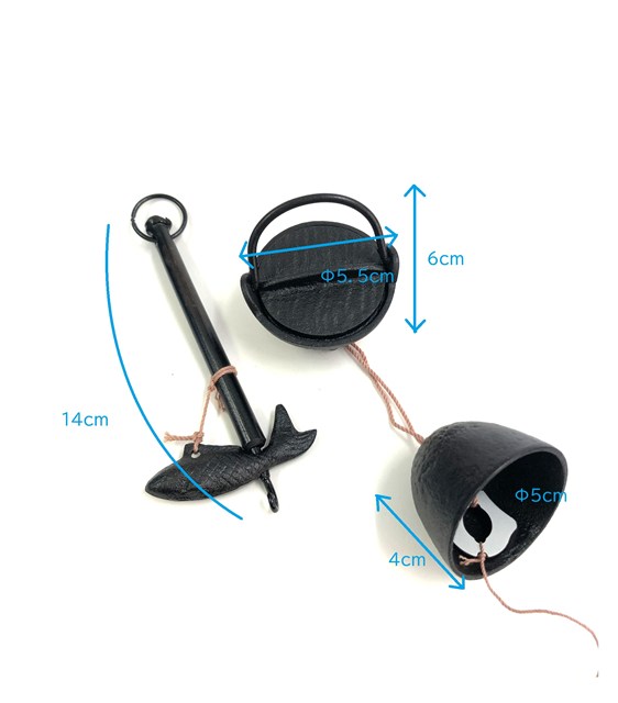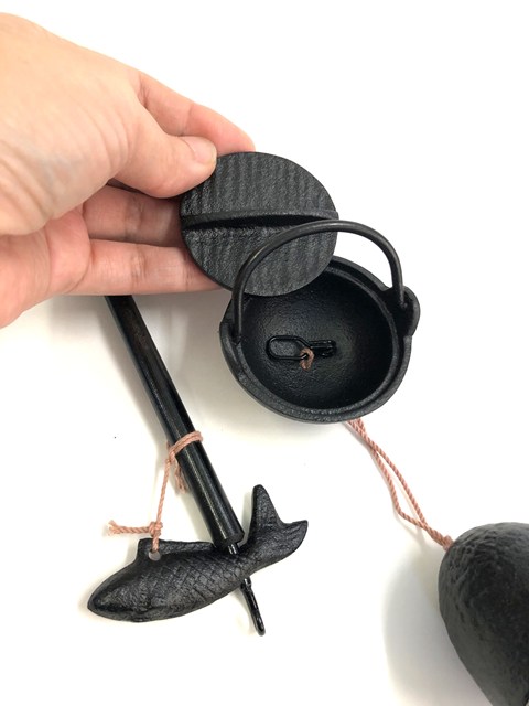 囲炉裏の風景をミニチュアにしたような自在鉤の風鈴です。支柱の部分は木製です。吊り下げられたお鍋の蓋は開けられるようになっています。QRコードから音色をご確認いただけます。サイズは画像内をご参照ください。南部鉄器の風鈴です。